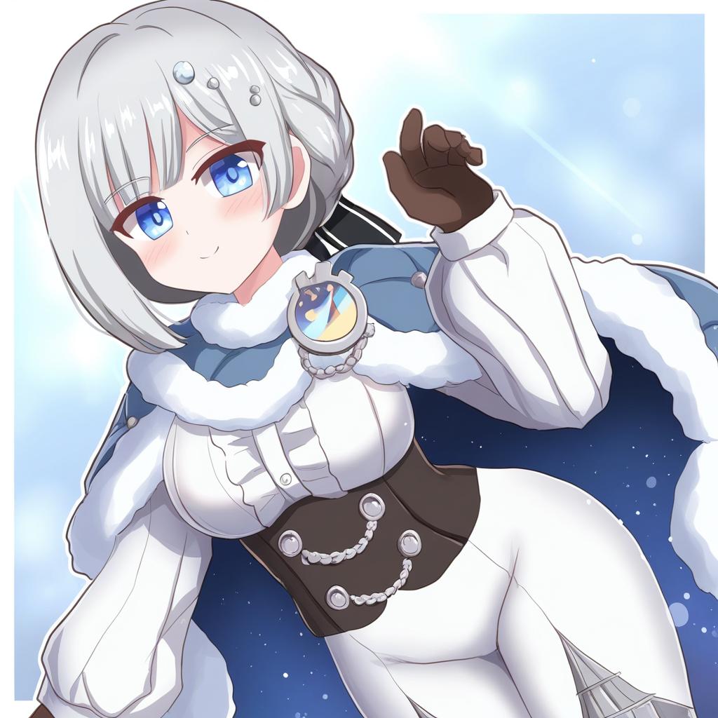 Digital illustration of a young anime girl with short grey hair and bright blue eyes. She is dressed in a white bodysuit with a black corset and a white frilled shirt underneath. Wearing a blue fur-trimmed cape with a badge and black gloves, she has a braid and hair ornaments, depicted with a subtle smile. The style is detailed and vibrant, featuring elements typical of fantasy or anime character design.