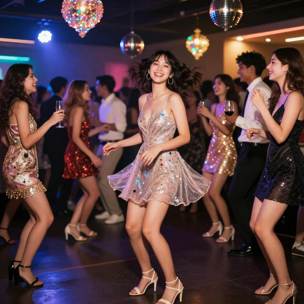 Short dress heels, glamorous party scene with colorful lights, sparkling decorations, joyful crowd, dynamic movement, vivid colors, high detail