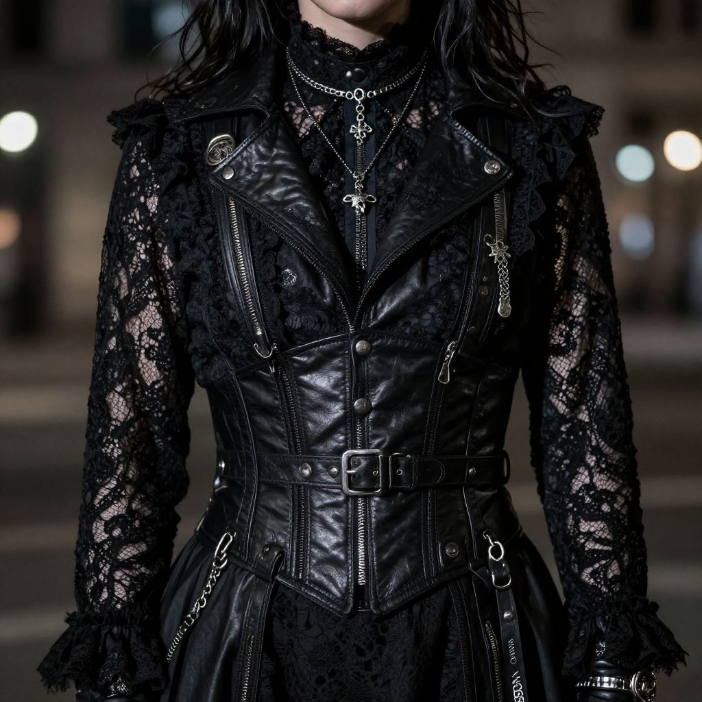 Goth uniform, dark Victorian-inspired attire with lace, leather, and silver accessories, moody lighting, urban nighttime setting, mysterious atmosphere, detailed textures