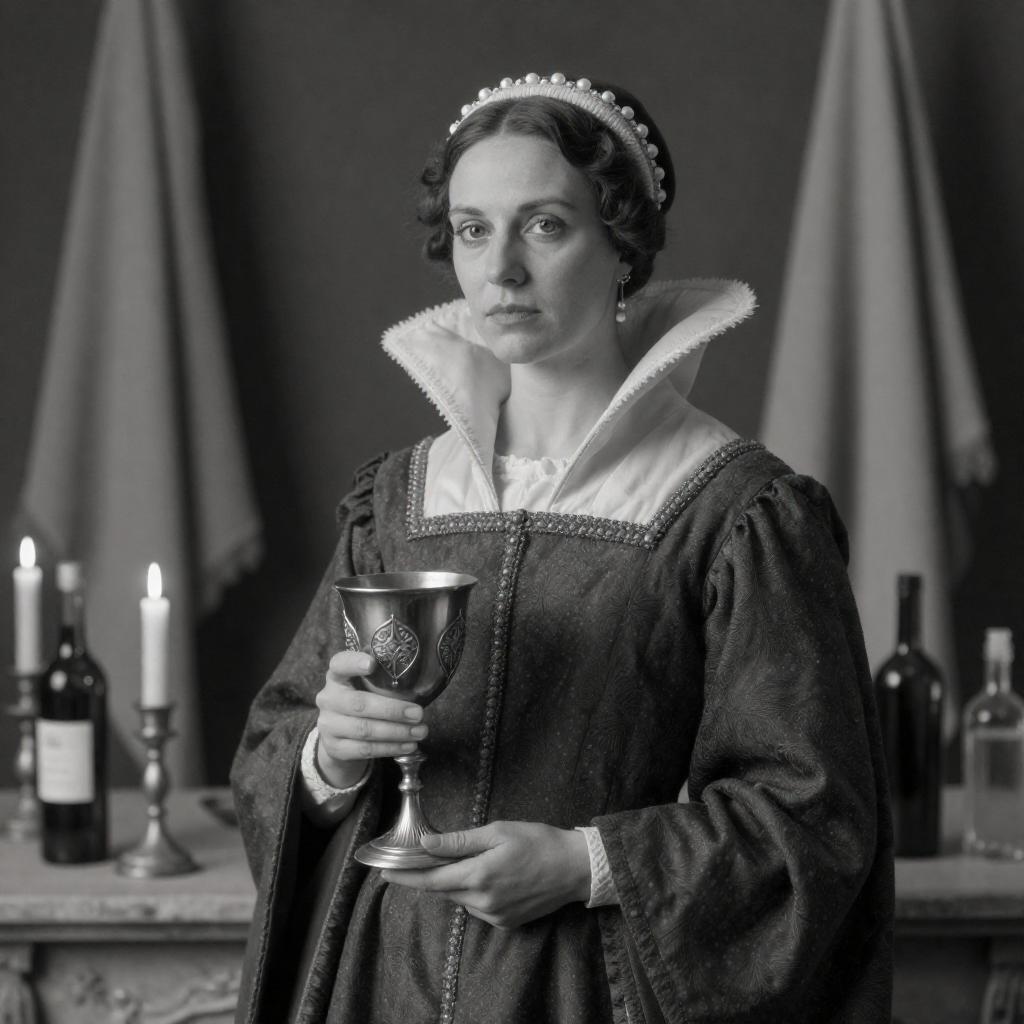 Black-and-white photograph of six people in Renaissance-style costumes. Three women and three men, wearing hats, striped and patterned clothing, and ornate dresses. One man raises his arm. Intense expressions. Background includes trees and a building.