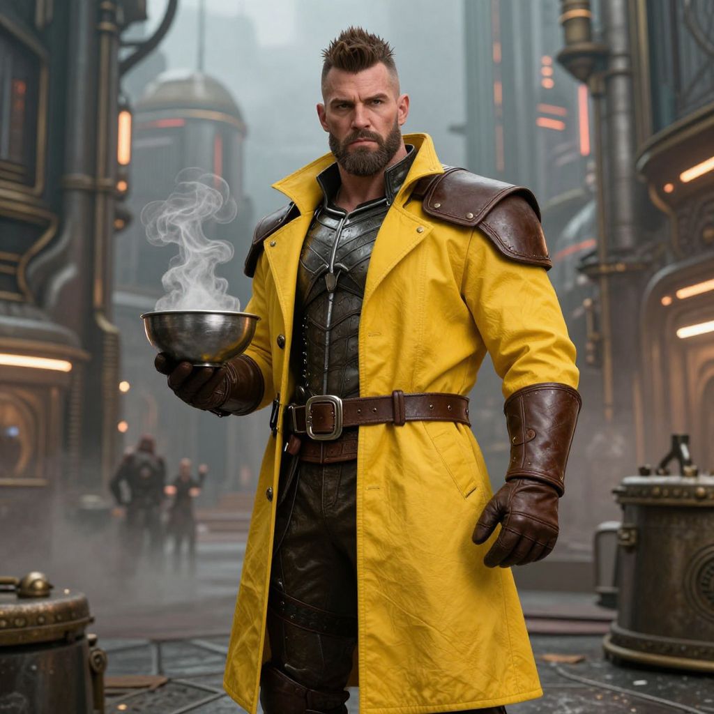 A muscular, bearded man with short, spiked brown hair stands confidently in a steampunk cityscape. He's wearing a bright yellow, knee-length coat with brown leather shoulder pads and gloves, over a dark armored shirt. He holds a steaming metal bowl in his right hand. The background features intricate, industrial buildings with glowing lights and fog. The overall vibe is futuristic and adventurous.