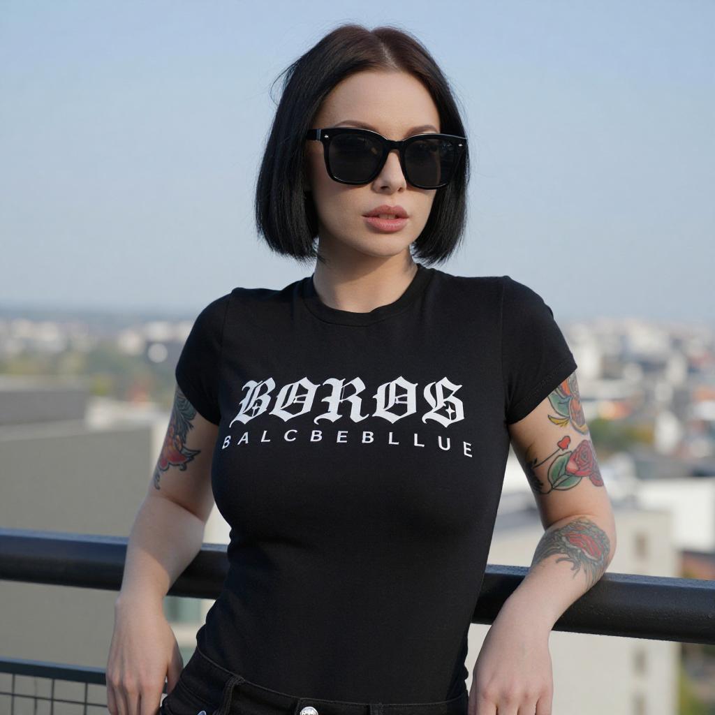 Photograph of a woman with pale skin, black bob haircut, and large black sunglasses. She wears a tight black t-shirt with white Gothic lettering, accentuating her large breasts. Her arms, visible on either side, display colorful tattoos. She leans on a balcony railing, with a blurred urban cityscape and clear blue sky in the background.