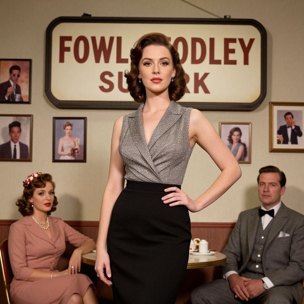 Photograph of a vintage-style TV show set featuring a confident, fair-skinned woman with dark, wavy hair and red lipstick, wearing a cream, sleeveless, V-neck dress with a black belt, standing in the foreground. She has a curvy figure and is posing with one hand on her hip. In the background, four seated individuals in 1950s attire—two women in red and pink dresses and two men in white and grey shirts and ties—are watching. The wall behind them has framed photos and a large sign reading "FOWL STOLEY SURPRISE" in bold red letters. The overall style is retro with warm lighting.