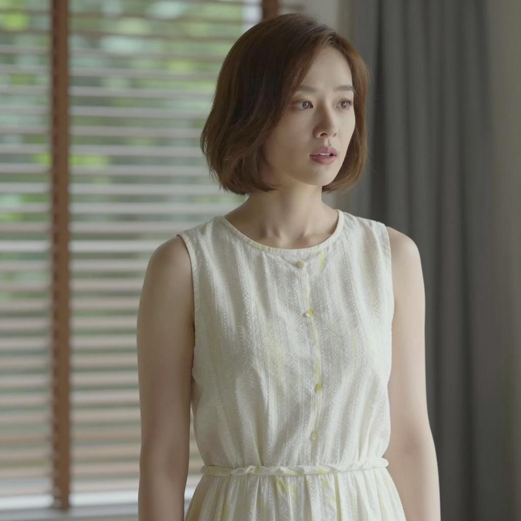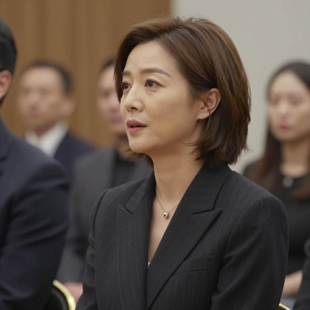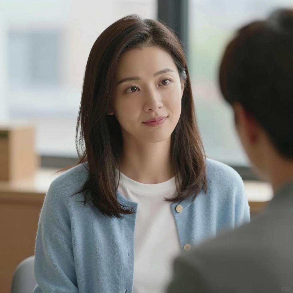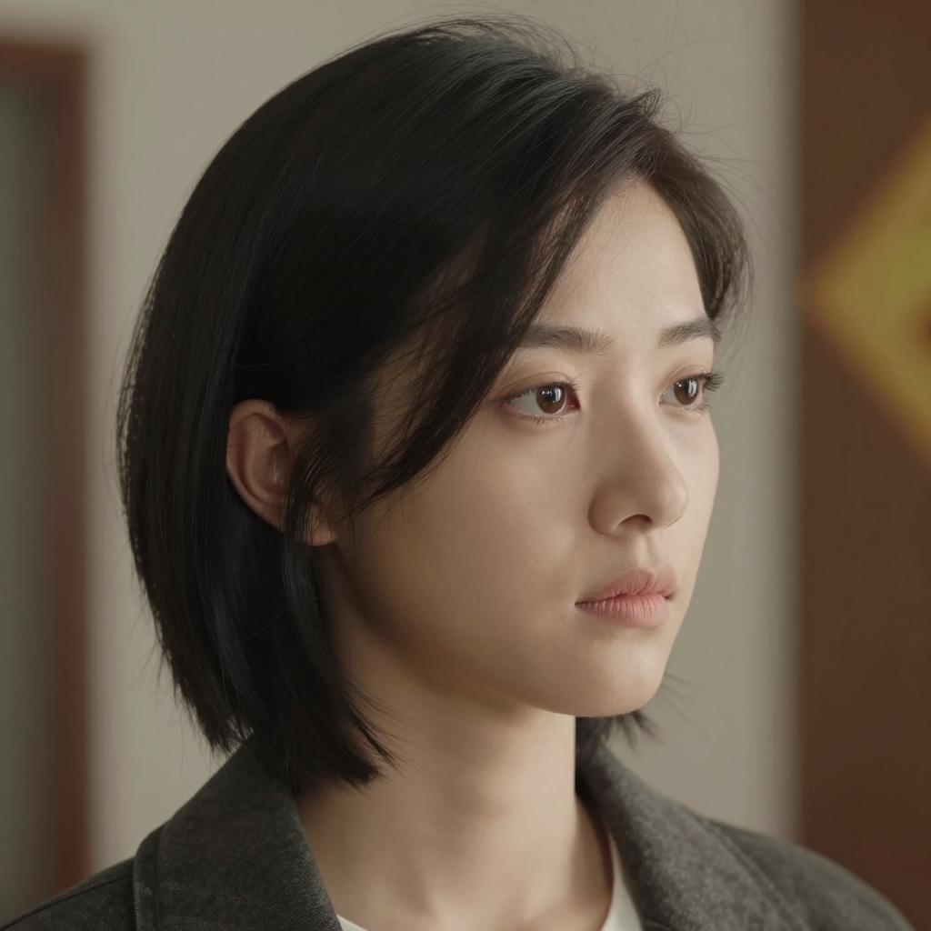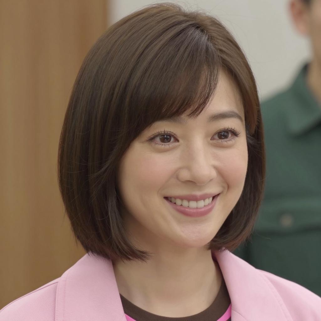 Close-up photograph of a woman with short, dark brown hair and bangs. She has light skin, brown eyes, and a smile showing white teeth. She wears a pink jacket over a striped pink and brown top. The background includes a wooden panel and a blurred person in green.
