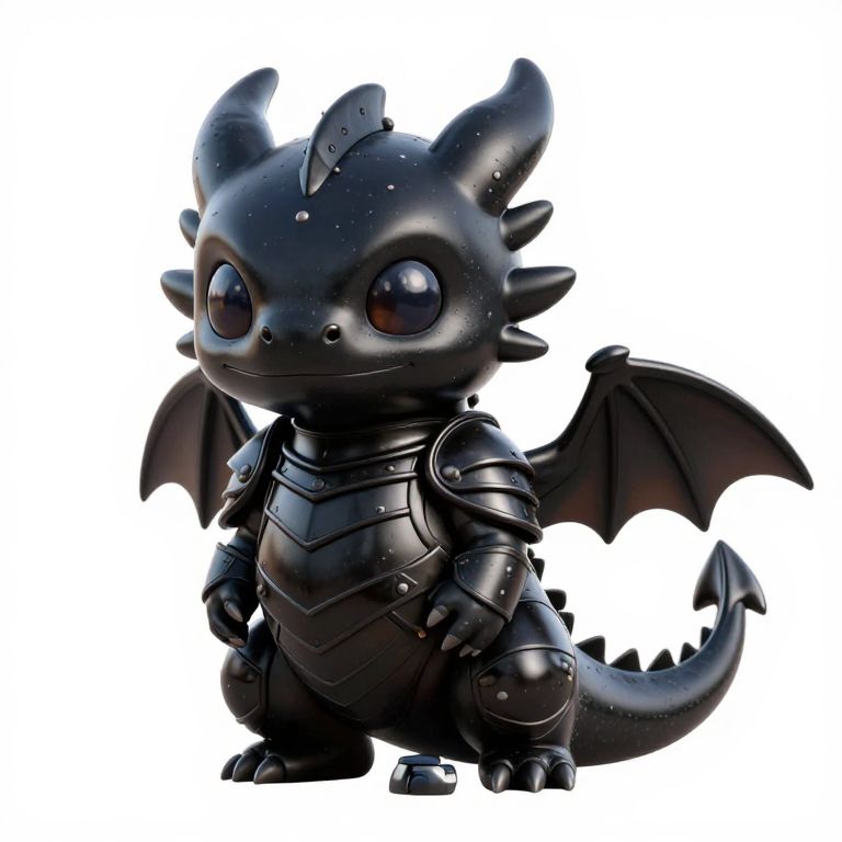 Chibi-style digital rendering of a small, black, armored dragon with large, shiny eyes, black wings, and a metallic texture.