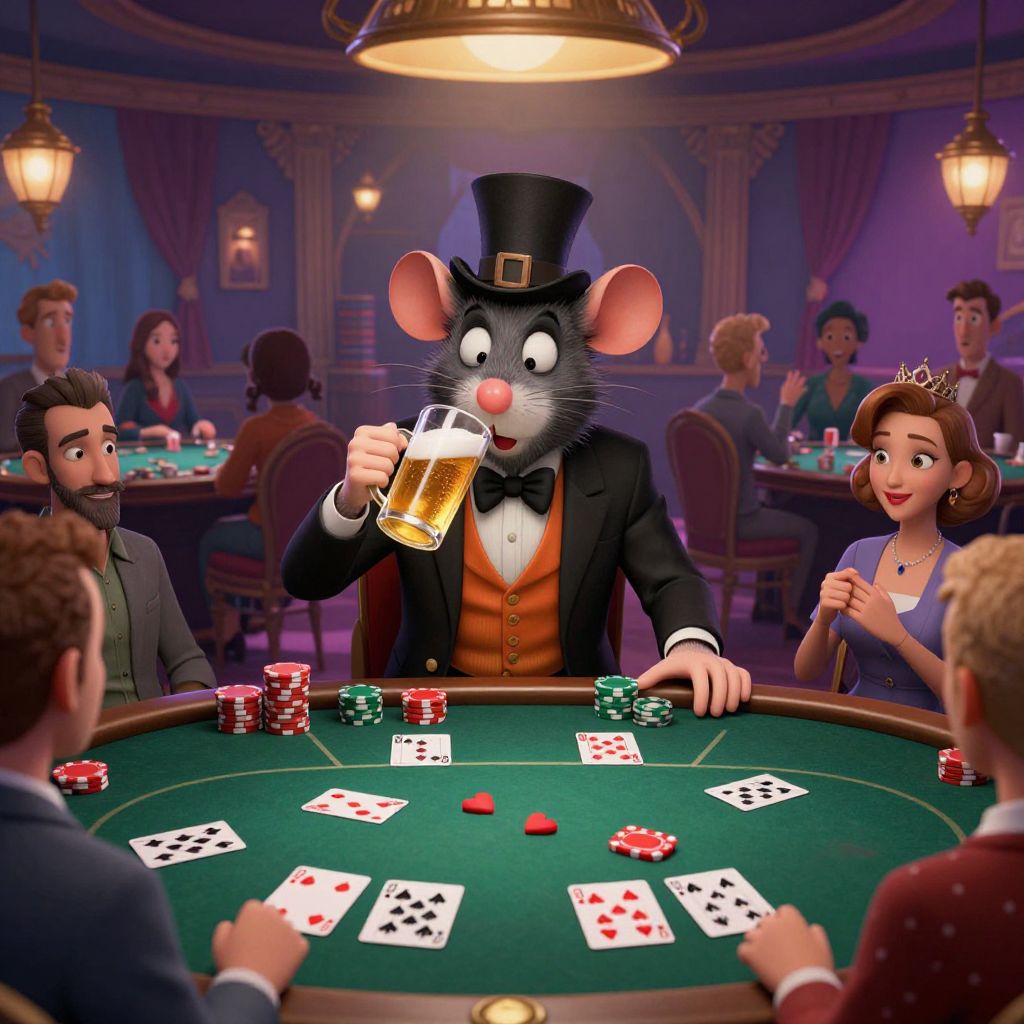 CGI illustration of a top-hatted, anthropomorphic rat dealer at a poker table, serving beer, surrounded by dressed-up players in a dimly