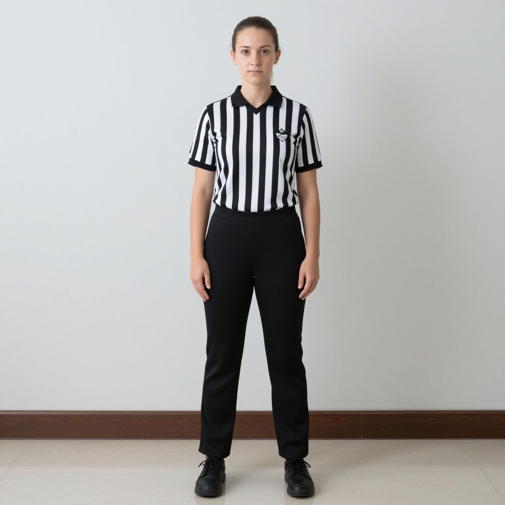 "Woman Referee Pants, woman in a referee ' s uniform standing in front of a wall"