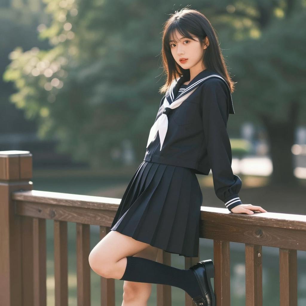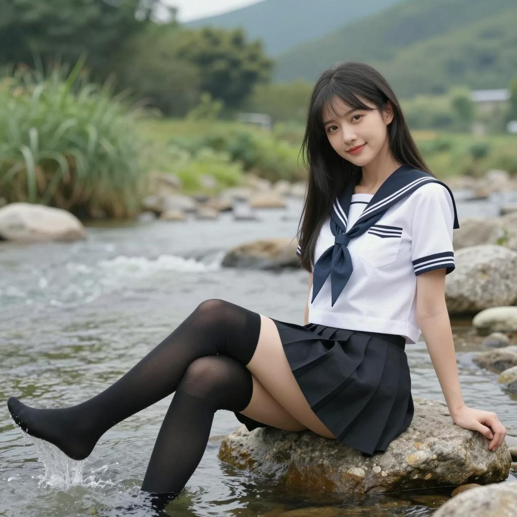 Asian woman with long black hair, sitting on a rock in a river, wearing a white sailor uniform with navy blue trim, black skirt, and black thigh-high stockings. Her right leg is in the water, left leg crossed over. Background includes greenery and blurred water. She smiles slightly, looking at the camera. Light green forest and hills in the background. Bright daylight. Natural outdoor setting.