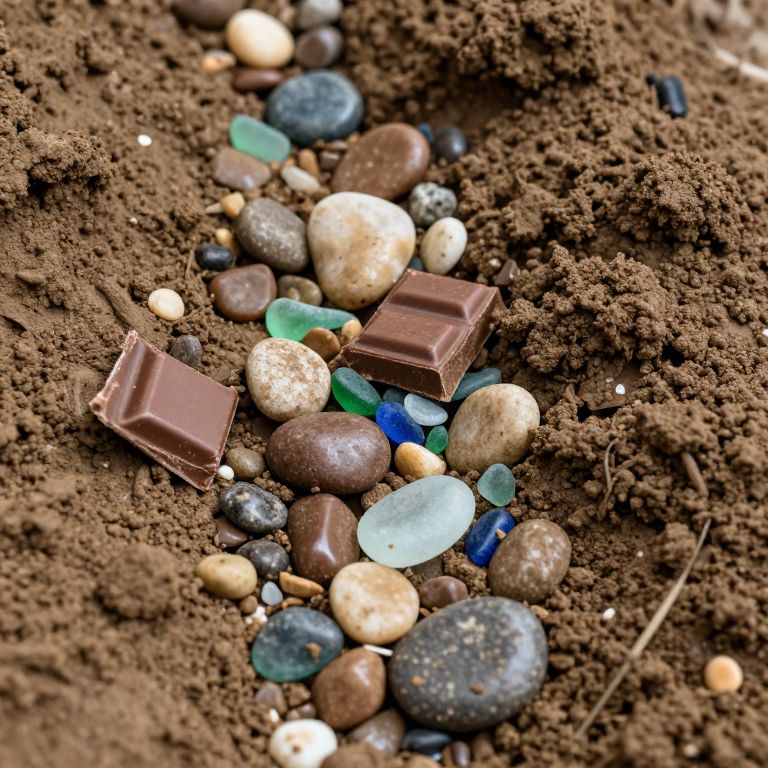 Photograph of chocolate squares and various colorful pebbles scattered on rich, brown soil, creating a striking contrast between textures.