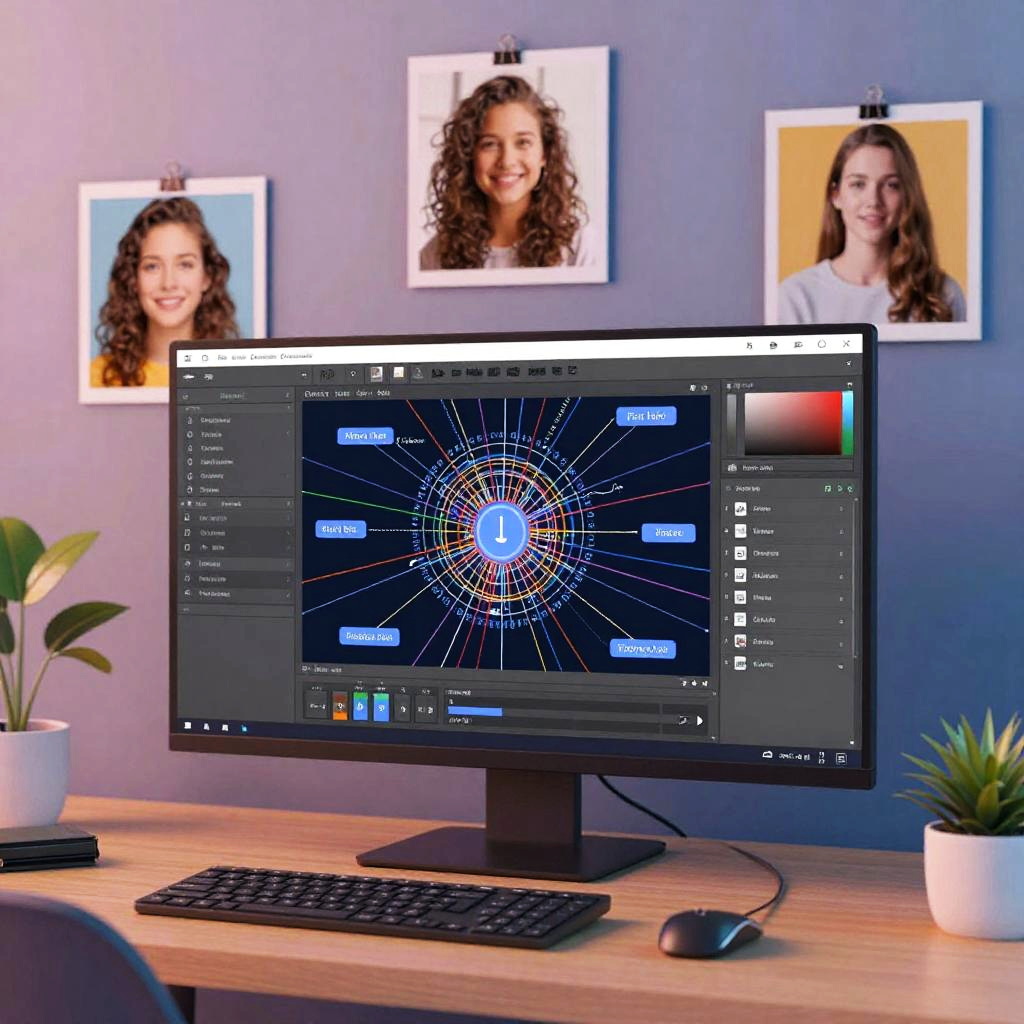 Abstract representation of an AI online photo editor's neural network interface, visualizing data flow and algorithmic enhancement overlaid on a colorful, surreal photo editing workspace with multiple floating panels and digital brushes.