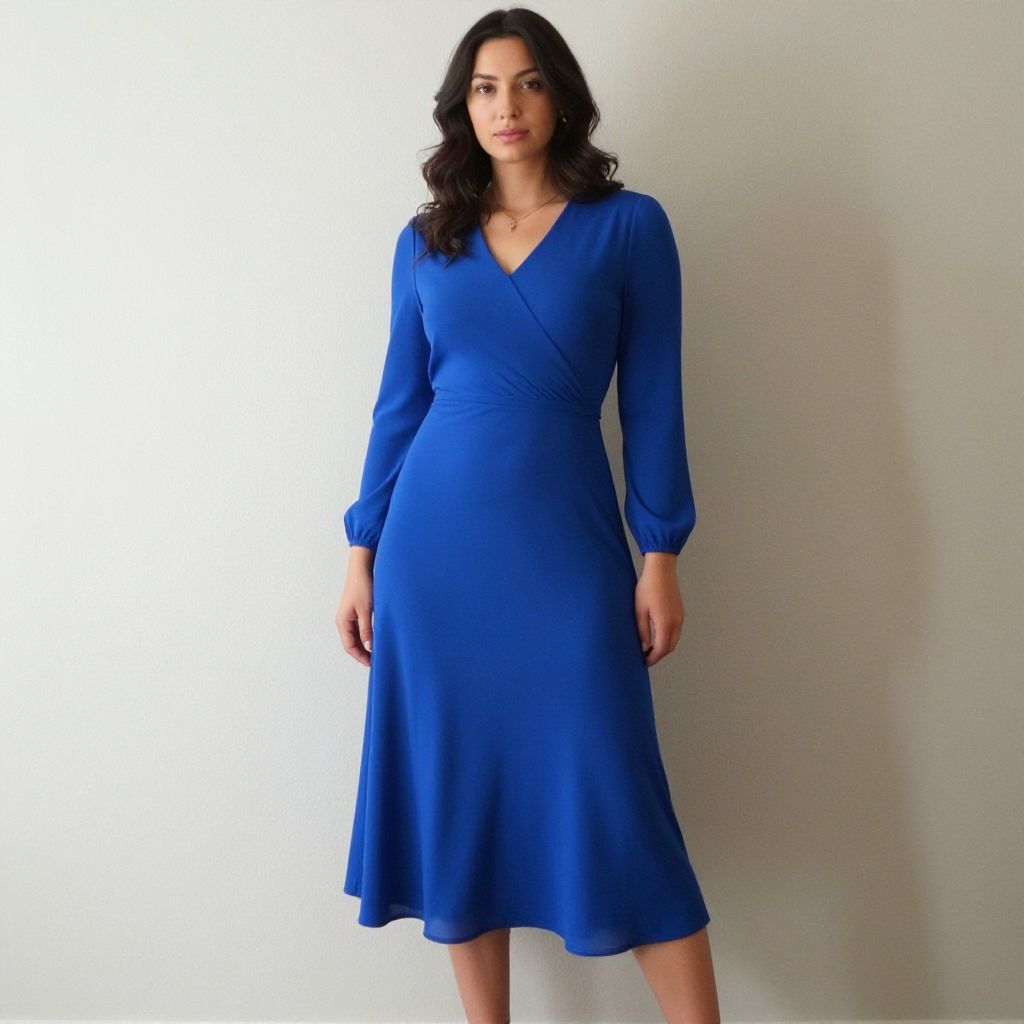 Photograph of a dark-haired woman with wavy hair, wearing a vibrant blue, long-sleeve, V-neck, knee-length dress, standing