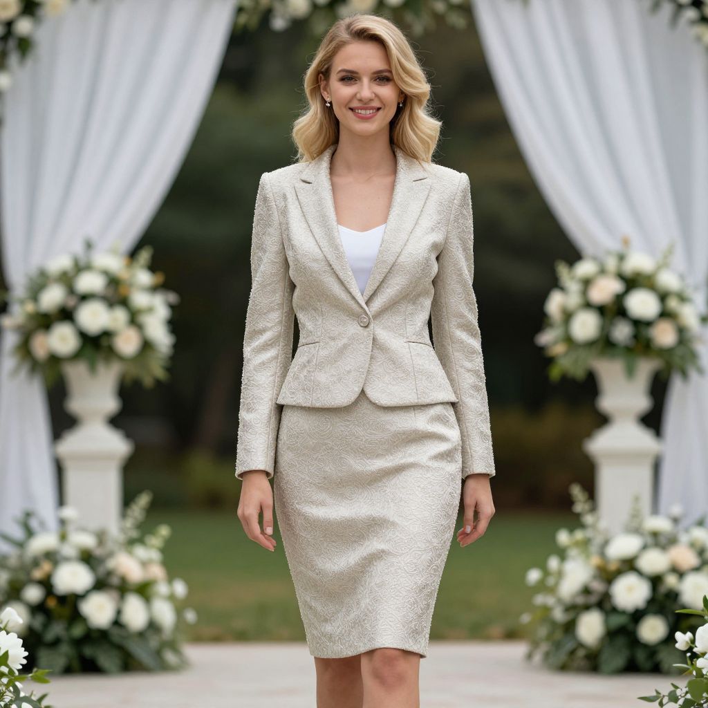 Woman skirt suit weddings, 1girl, solo, flower, skirt, blonde hair, jacket, realistic, photorealistic, photo background, smile, pencil skirt