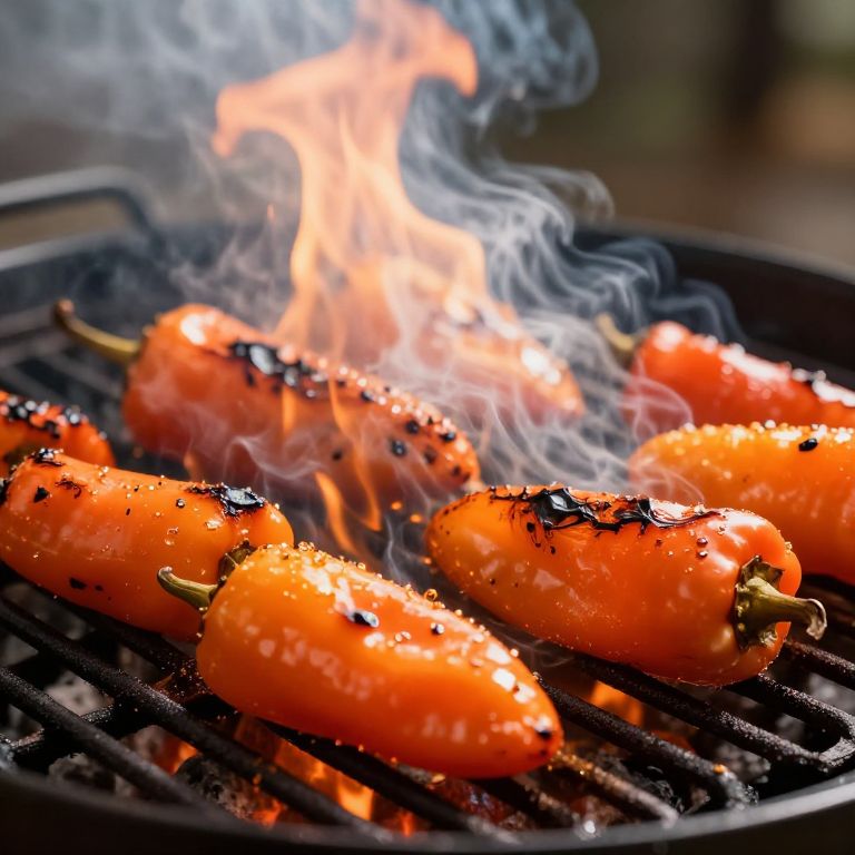 Jalapeno peppers sizzling on a hot grill, smoke rising and flames flickering, rich warm colors with contrast of char marks on the pepper skin, vibrant and appetizing, outdoor barbecue atmosphere, hyper-realistic food photography.