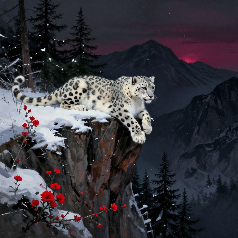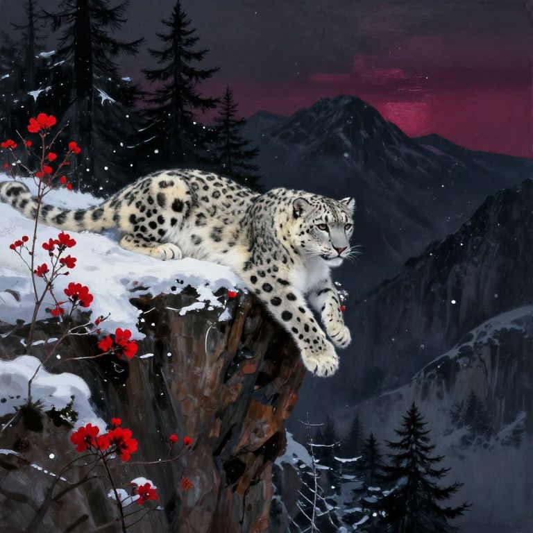 Vibrant brushstrokes dance across the canvas as a majestic white snow leopard lies precariously close to the edge of a rugged cliff, Its paws dangle down amidst crimson flowers blooming in the snow, surrounded by towering fir trees against the somber backdrop of black winter mountains, As night falls, the air is heavy with darkness and gloom, yet a hint of burgundy sunlight lingers on the horizon, casting an ethereal glow across the scene, Winter's chill is palpable as snowflakes gently fall, capturing every detail in high definition