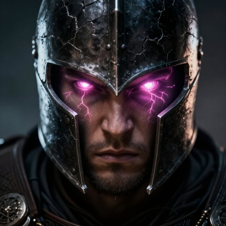 Close-up portrait of a fantasy warrior wearing a cracked antique metal helmet with a fierce and battle-hardened expression. The warrior's eyes glow bright pink with magical energy, featuring visible glowing veins radiating around the eyes. Dramatic lighting highlights the detailed textures of the worn armor and intense facial features, creating a mystical and powerful atmosphere.