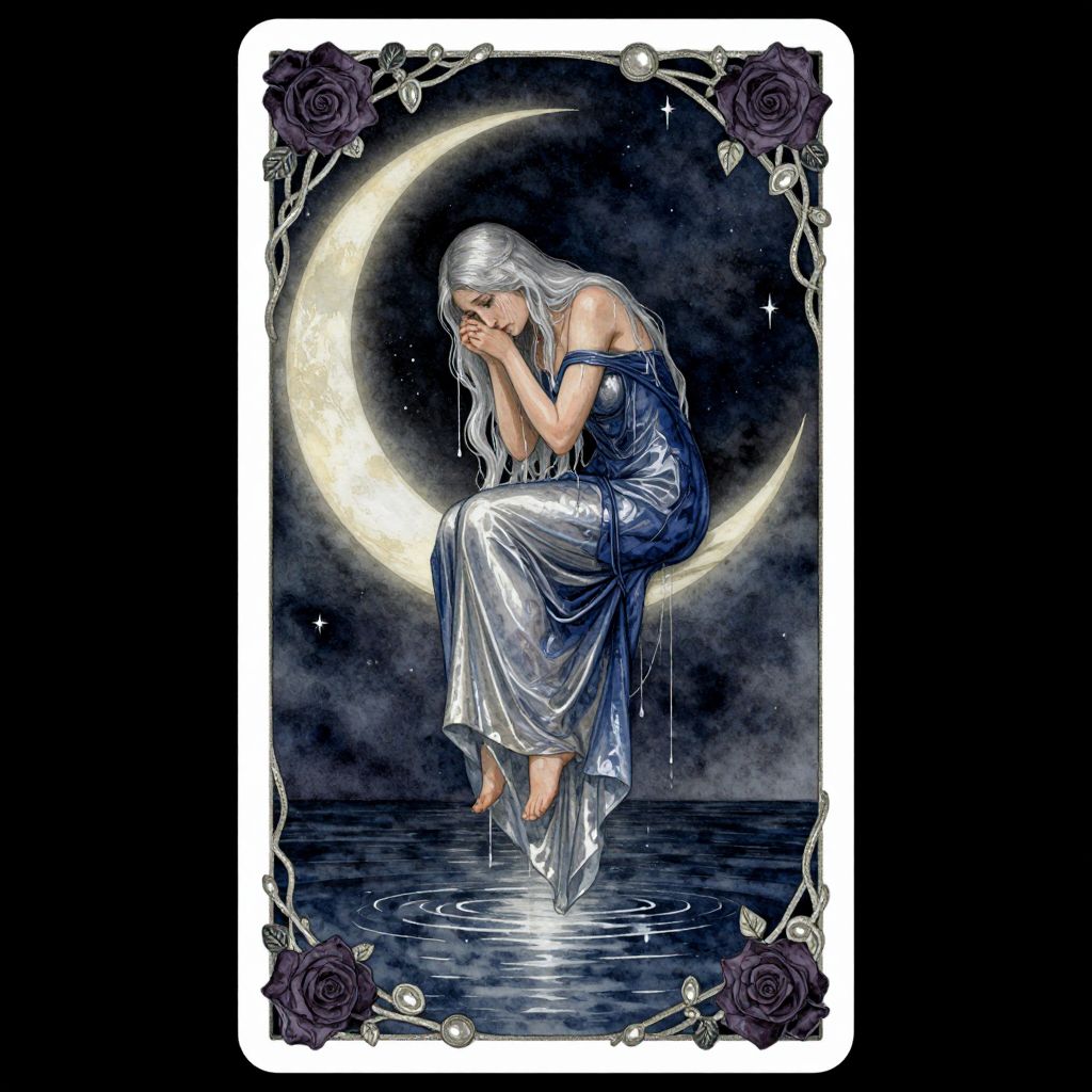A haunting yet beautiful ArsMJStyle, Watercolor Portrait in Art nouveau style, major arcana Tarot card, centered on sorrow, At the card’s center, a sorrowful woman sits in a graceful, hunched position on the edge of a crescent moon, her long silver hair cascading over her shoulders like a waterfall of tears, Her gown, a delicate mix of deep blues and silver, pools around her like the night sky, blending into the background, Her head is bowed deep grief, her posture conveying intense sorrow and loss, The background is a starless, dark sky, with only the pale light of the crescent moon casting a soft glow over her figure, Below her, the sea is calm but dark, reflecting the moon’s light in ripples, symbolizing quiet, reflective sadness, The card’s border is adorned with twisted, delicate vines, where dark roses bloom—wilted but still beautiful, Subtle silver accents illuminate the edges, and tears seem to shimmer in the night, highlighting the contrast between beauty and melancholy, Hand, Conceptual, Impressionistic