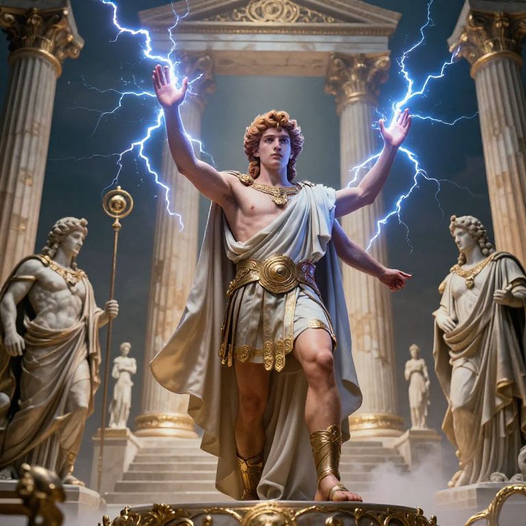 Zeus your son has returned standing in front of Mount Olympus, with lightning emanating from his hands, majestic and divine presence, ancient Greek gods and mythical symbols surrounding him, cinematic lighting emphasizing his power and legacy
