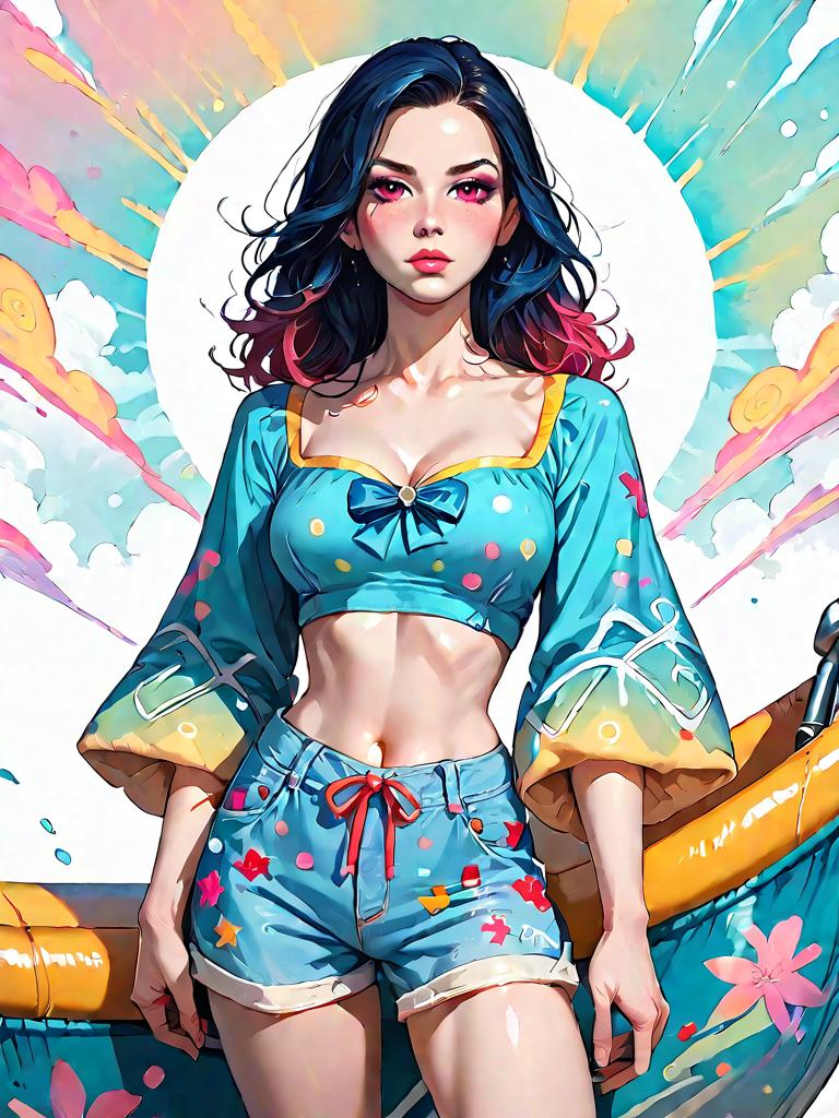 1girl, source_comics, realistic face, full body shot, Woman, vibrant, off-the-shoulder crop top with bold, colorful, psychedelic patterns, short ruffle sleeves, paired with denim shorts, drawstring waist, frayed hem, oversized round sunglasses, delicate gold chain bracelet.
