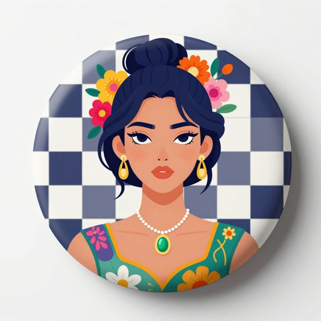 Circular phone grip featuring a vibrant illustration of a woman with dark hair styled in a bun adorned with colorful flowers, wearing gold earrings, a necklace with a green pendant, and a floral-patterned top against a checkered background.