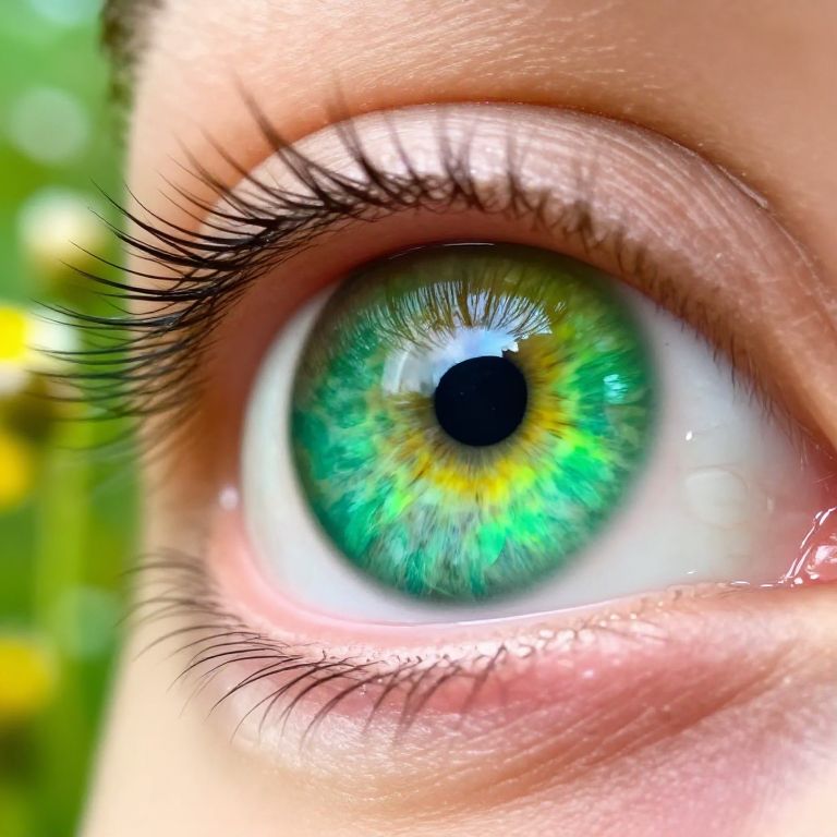 Green eyes with a captivating gaze, macro shot emphasizing the intricate patterns of the iris, vibrant shades of jade and lime green, natural daylight reflecting off moist eyes, soft bokeh background with hints of wildflowers and greenery.