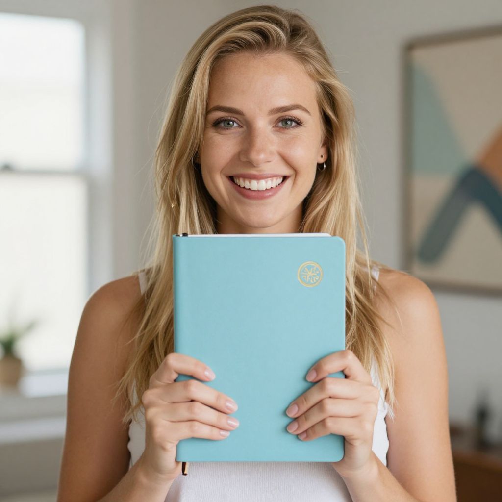 Blonde-haired woman smiling brightly while holding a light blue mindful travel journal with a gold logo, positioned centrally in front of her against a softly lit indoor background featuring a window and framed artwork.