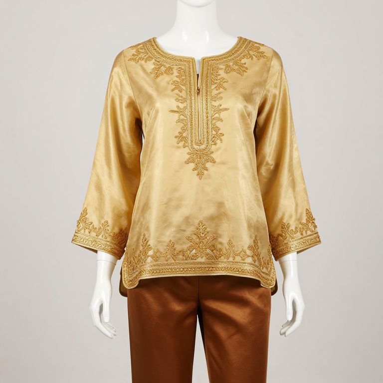 Photograph of a headless mannequin displaying a golden silk tunic with intricate embroidery, brown pants, and a simple round neckline.