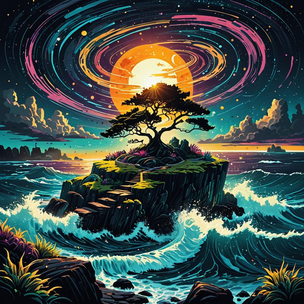 Lavender fields stretching across rolling hills, stylized and surreal landscape, swirling sky with flowing ribbon-like aurora, intense lighting with a large glowing sun, ocean waves crashing against rocks, dark and moody atmosphere, inspired by symbolism, vibrant colors and bold brushstrokes