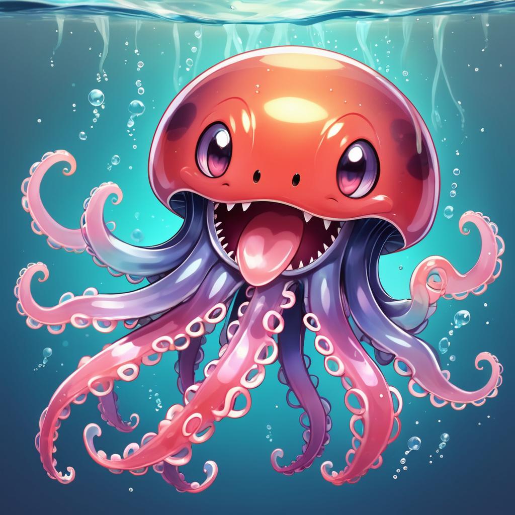 No humans, jellyfish, blurry, black eyes, tentacles, water, pokemon (creature), animal focus, gradient background, fish, full body, blurry background, slime (substance), creature, grey background, smile, tongue