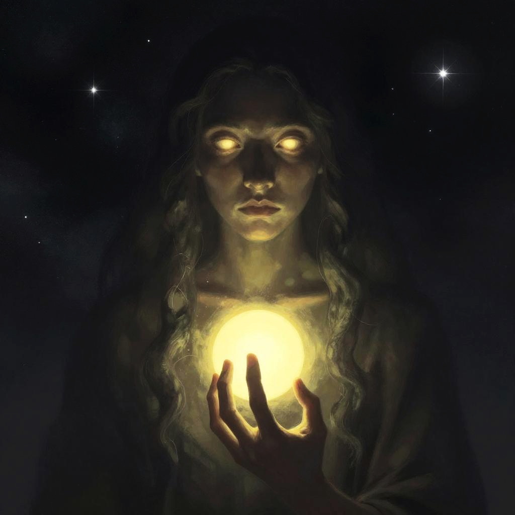 This is a digital painting of a shadowy figure with glowing eyes and a bright, circular light in their chest. The figure has dark, textured hair and is set against a cosmic, starry background. A hand reaches up towards the chest light, which emits a warm, yellow glow. The style is surreal and otherworldly, with a focus on light and shadow contrasts.