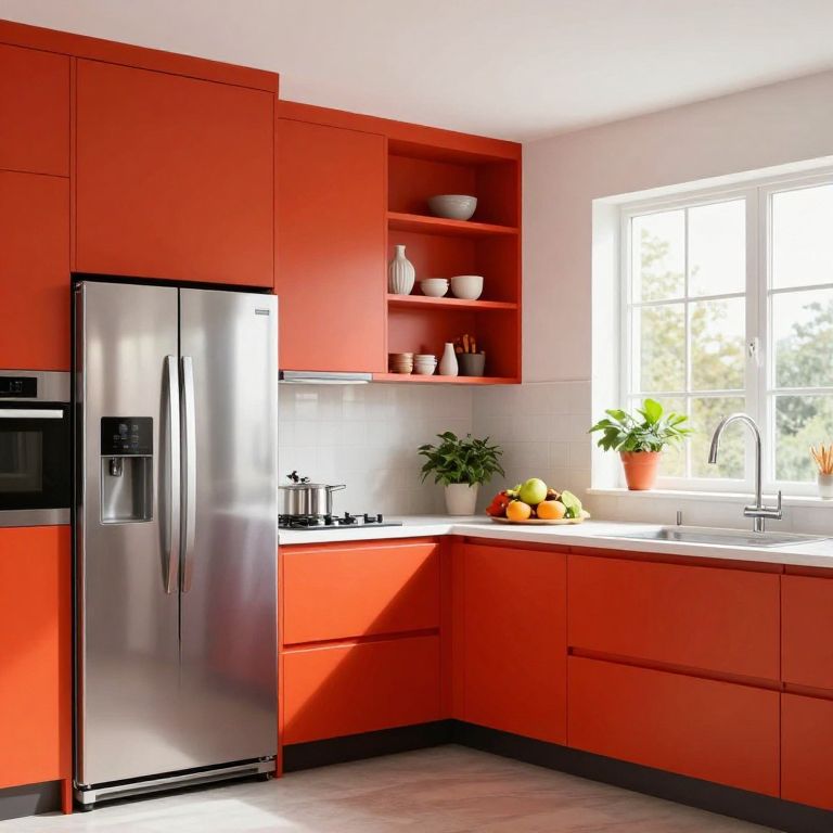 Vibrant red-orange cabinetry dominates a modern kitchen design, featuring sleek stainless steel appliances, open shelving with decorative items, and a countertop adorned with fresh produce and potted plants near a large window that lets in natural light.