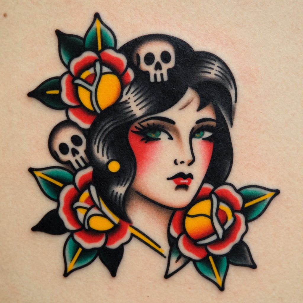 American traditional tattoo woman face, bold black outlines with vibrant red and yellow roses surrounding, classic tattoo style, strong expression, vintage nautical elements, skull accents, detailed shading, on textured skin background.