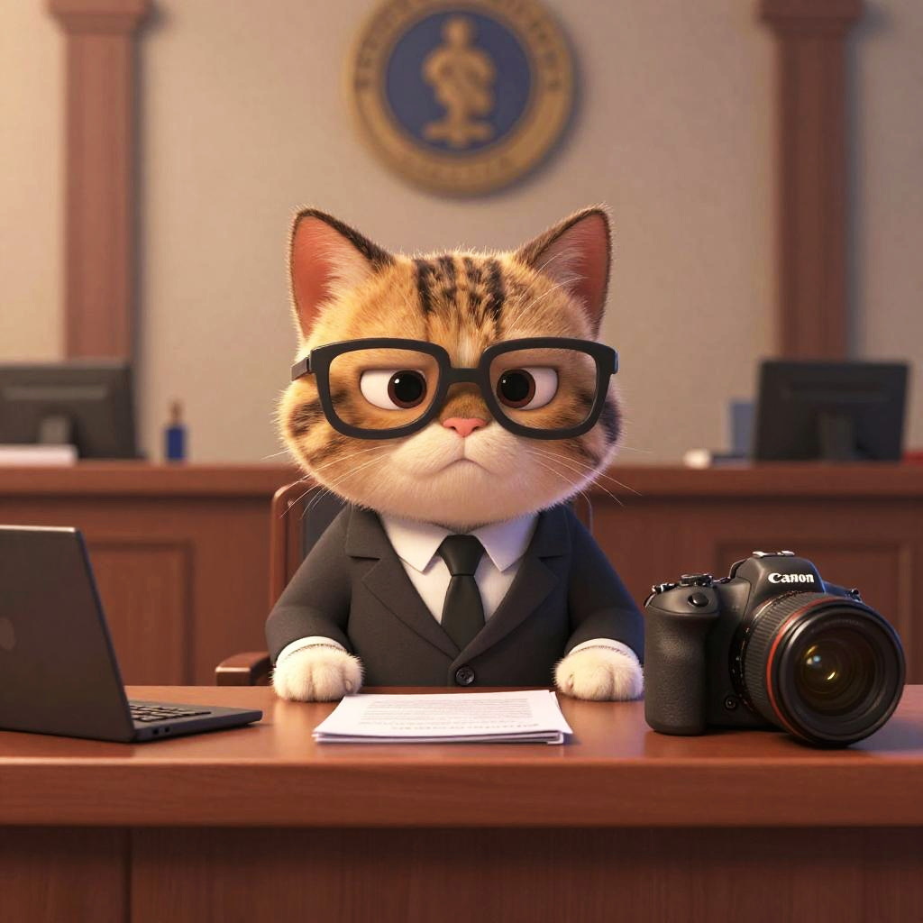 Realistic Pixar-style animated scene of a cat wearing a small black lawyer suit and glasses, sitting nervously at a courtroom defendant's table. The scene includes a wooden desk with a Canon camera and a laptop, symbolizing a legal or photographic context. The background features courtroom details like a judge's seal.