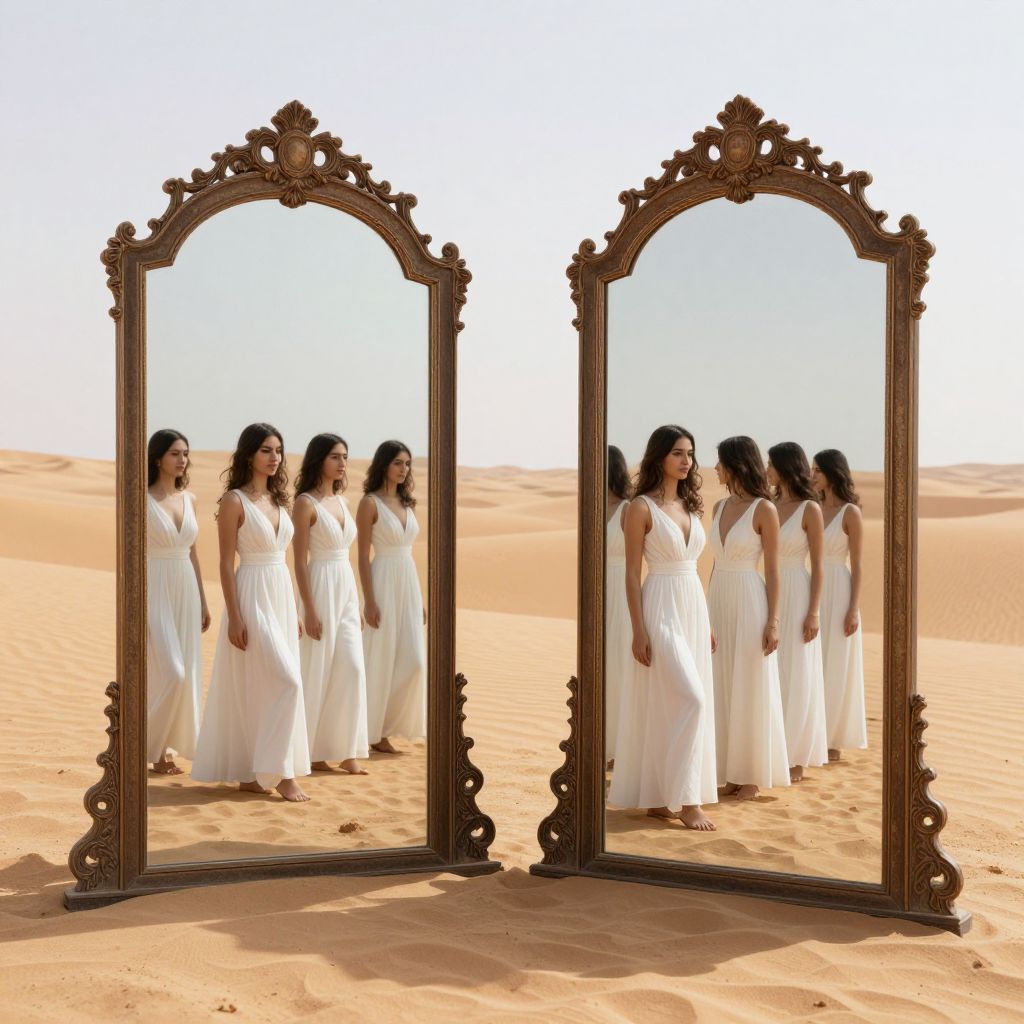 In a vast desert, two ornate mirrors stand side by side, each reflecting multiple, layered versions of a woman in a white outfit, creating an illusion of infinite depth and parallel realities.