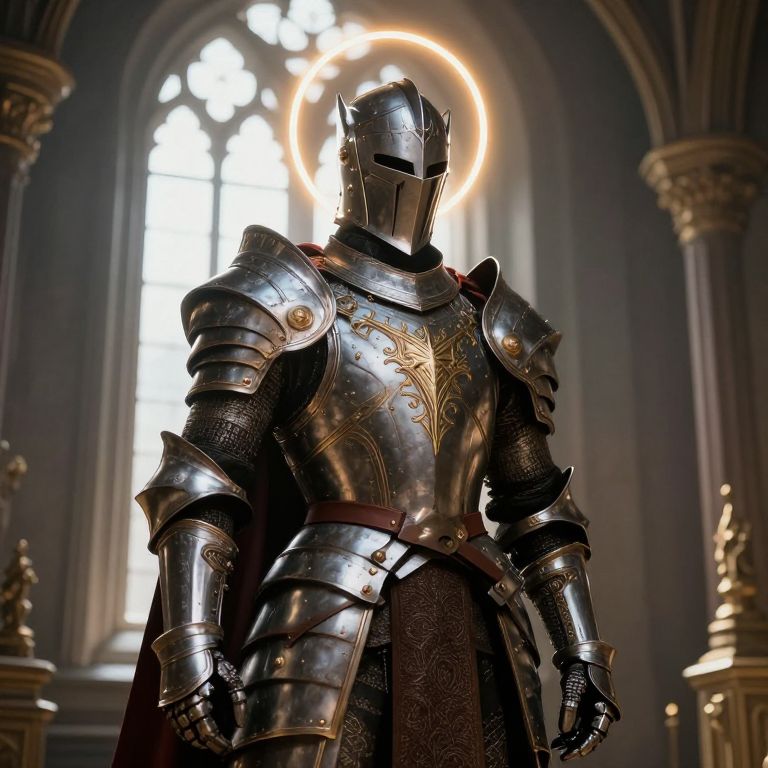 This is a CGI image of a medieval knight in polished, silver armor with intricate gold leaf designs on the chest plate. The knight wears a full helmet with a visor, and a glowing halo surrounds their head. The background features a grand, gothic-style cathedral with tall, arched windows letting in bright light, and ornate golden statues on either side. The armor is detailed with rivets and a dark, textured cape hangs from the waist. The knight stands centered, exuding a sense of authority and reverence, with light and shadow emphasizing the metallic texture of the armor.