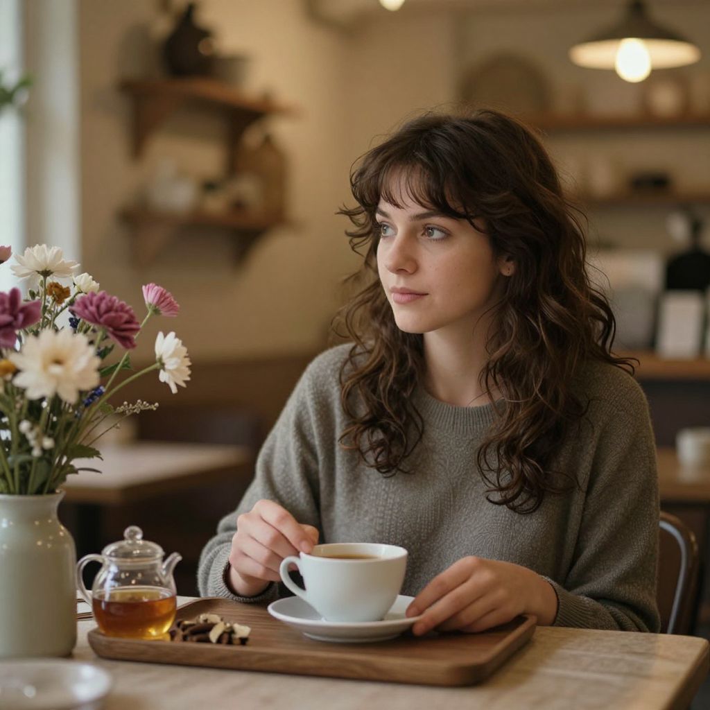 In a softly lit tea shop, a woman stirs her cup, her gaze drifting outward as the aroma of warm spices and blooming flowers intertwines with the echoes of cherished memories and the quiet whispers of solitude, evoking a tender blend of nostalgia and introspection.