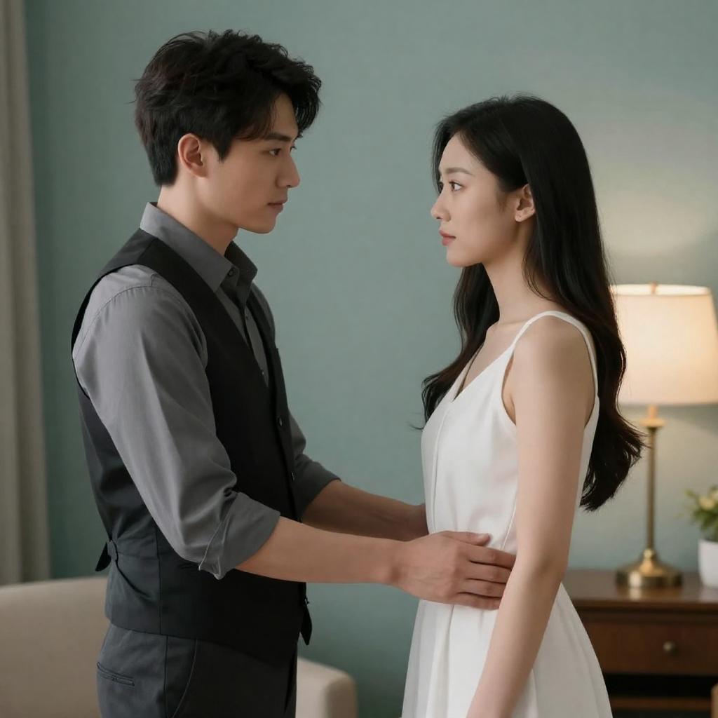 Photograph of a man with short dark hair in a black vest and gray shirt, gently holding the arm of a woman with long black hair, wearing a white sleeveless dress. They stand in a softly lit room with teal walls and a lamp in the background. The man faces her, while she looks slightly to the side.