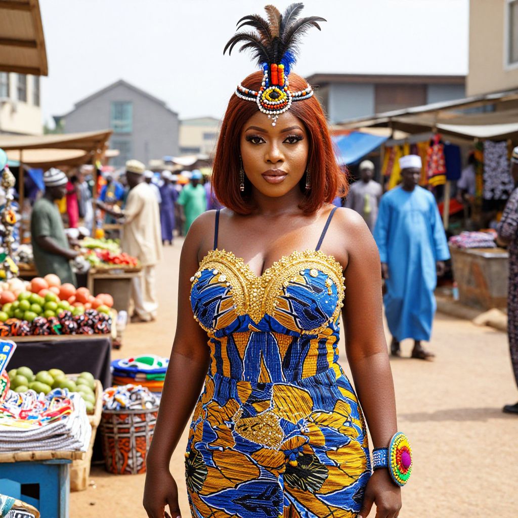A stylish African dress woman with vibrant red hair and warm brown eyes stands confidently in a sunny market square in Nigeria, wearing a traditional kente cloth dress with golden beadwork, a bold headpiece made of beads and feathers, and a colorful handcrafted accessory on her wrist. The setting features colorful stalls selling fresh produce, local crafts, and handmade fabrics, with people in traditional attire walking by in the background.. The woman has big tits and cute face