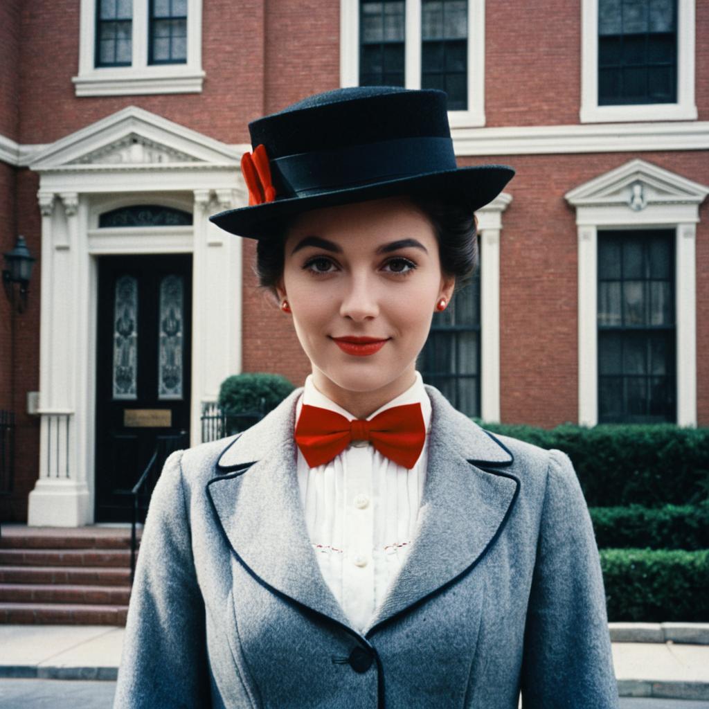 Mary Poppins Costume Adults face swap, woman in blue dress and hat standing on sidewalk in park
