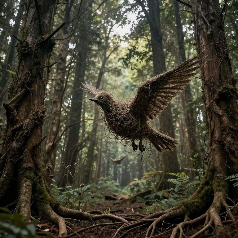 Photograph of a forest scene with a bird mid-flight, wings fully spread, surrounded by tall, dense trees with thick trunks and lush green undergrowth. The bird, covered in a tangled mass of dry twigs and feathers, appears to be in the process of nesting or escaping. Soft, diffused light filters through the forest canopy, creating a serene, almost magical atmosphere. The background features a blurred, sunlit clearing, adding depth to the image. The overall color palette includes earthy browns, greens, and dappled sunlight. The photograph captures a moment of natural beauty and wildlife behavior.