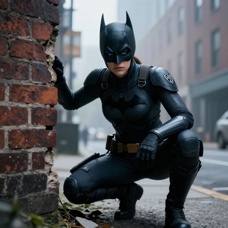 Photograph of a female Batman in black armored suit with bat ears, crouching by a broken brick wall in a foggy urban alley.