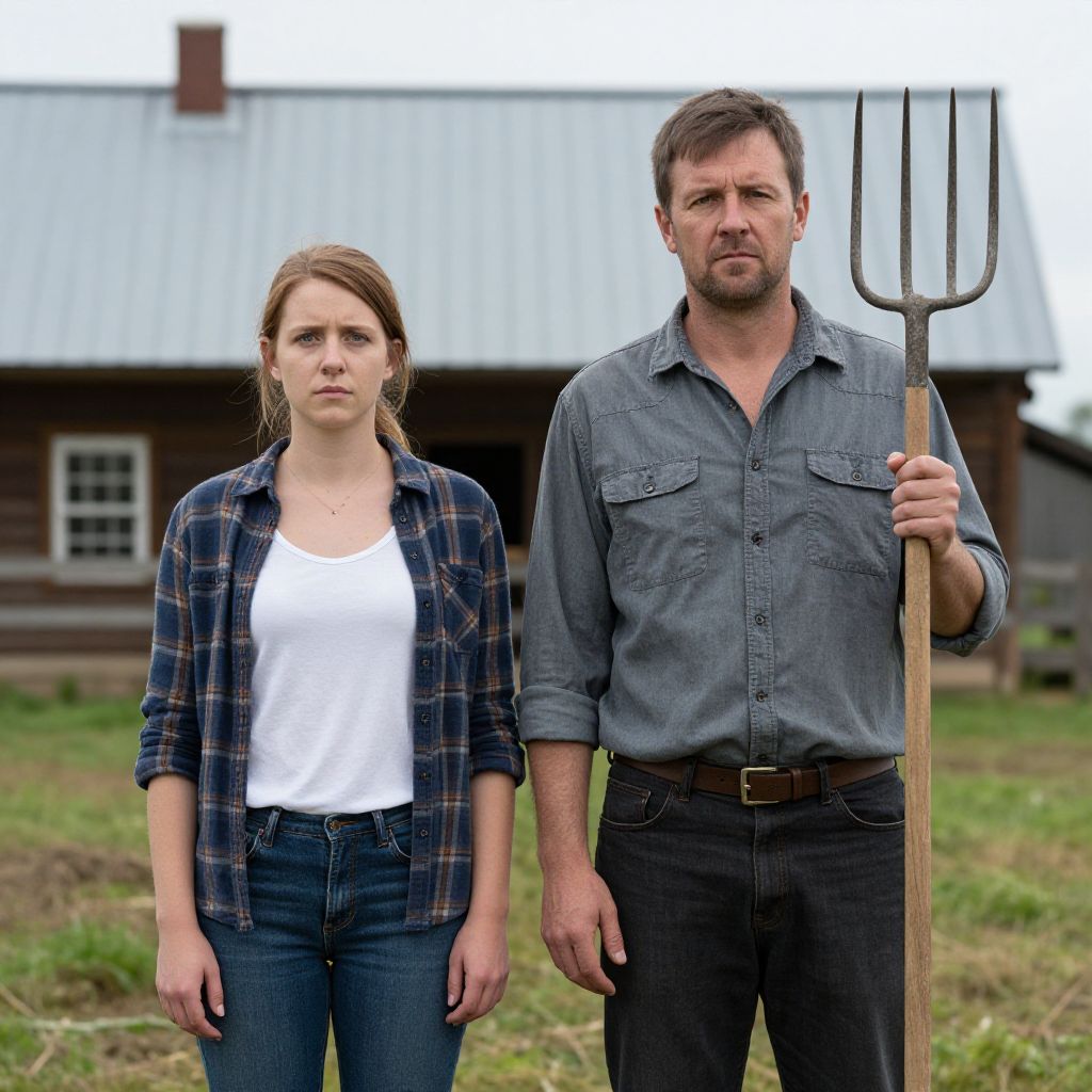 Photograph of a young Caucasian woman and a middle-aged Caucasian man standing outdoors in front of a rustic wooden barn with a metal roof. The woman has light brown hair in a ponytail, wears a white tank top, blue jeans, and a blue plaid shirt. The man has short brown hair, a beard, and is dressed in a gray button-up shirt and dark jeans, holding a wooden pitchfork in his right hand. The background features a grassy field and the barn's window and door are visible. Both individuals have serious expressions.