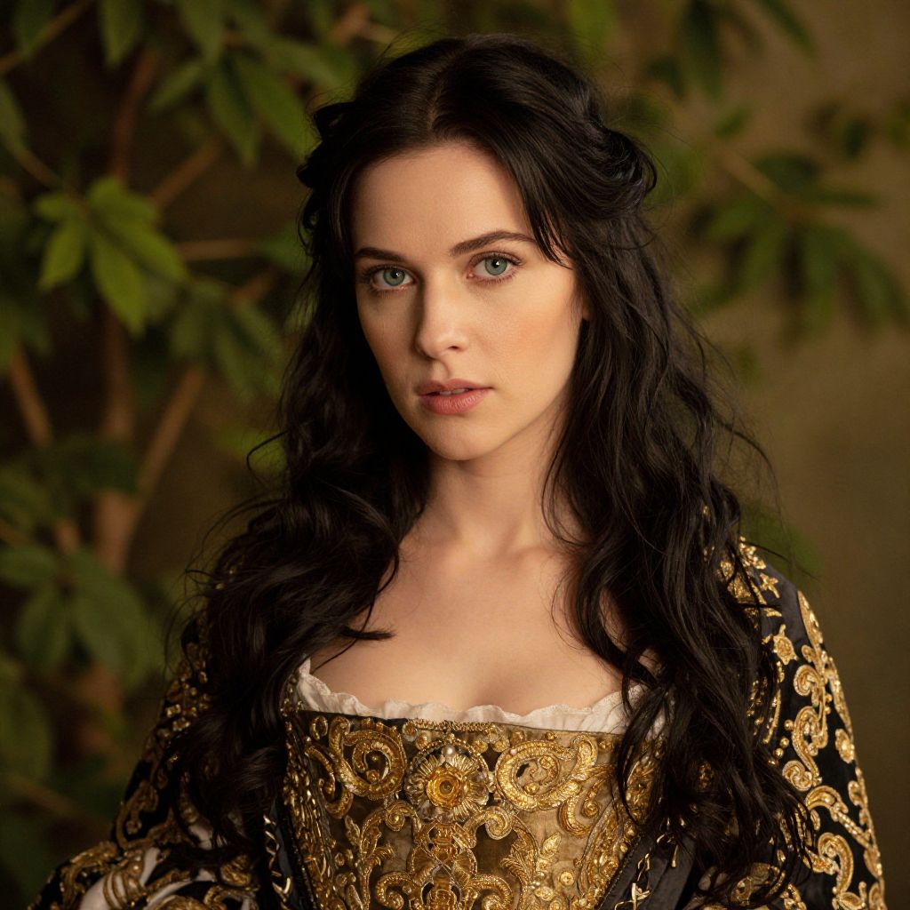Photograph of a pale-skinned woman with long, wavy black hair and striking blue eyes, wearing an ornate, gold-embroidered black dress with a white lace trim. The background features blurred green foliage, creating a natural, earthy contrast to her elegant attire. Her expression is neutral, with slightly parted lips. The lighting is warm, highlighting her delicate features and the intricate details of her dress. She exudes a regal, timeless quality, reminiscent of historical or fantasy character portrayals.