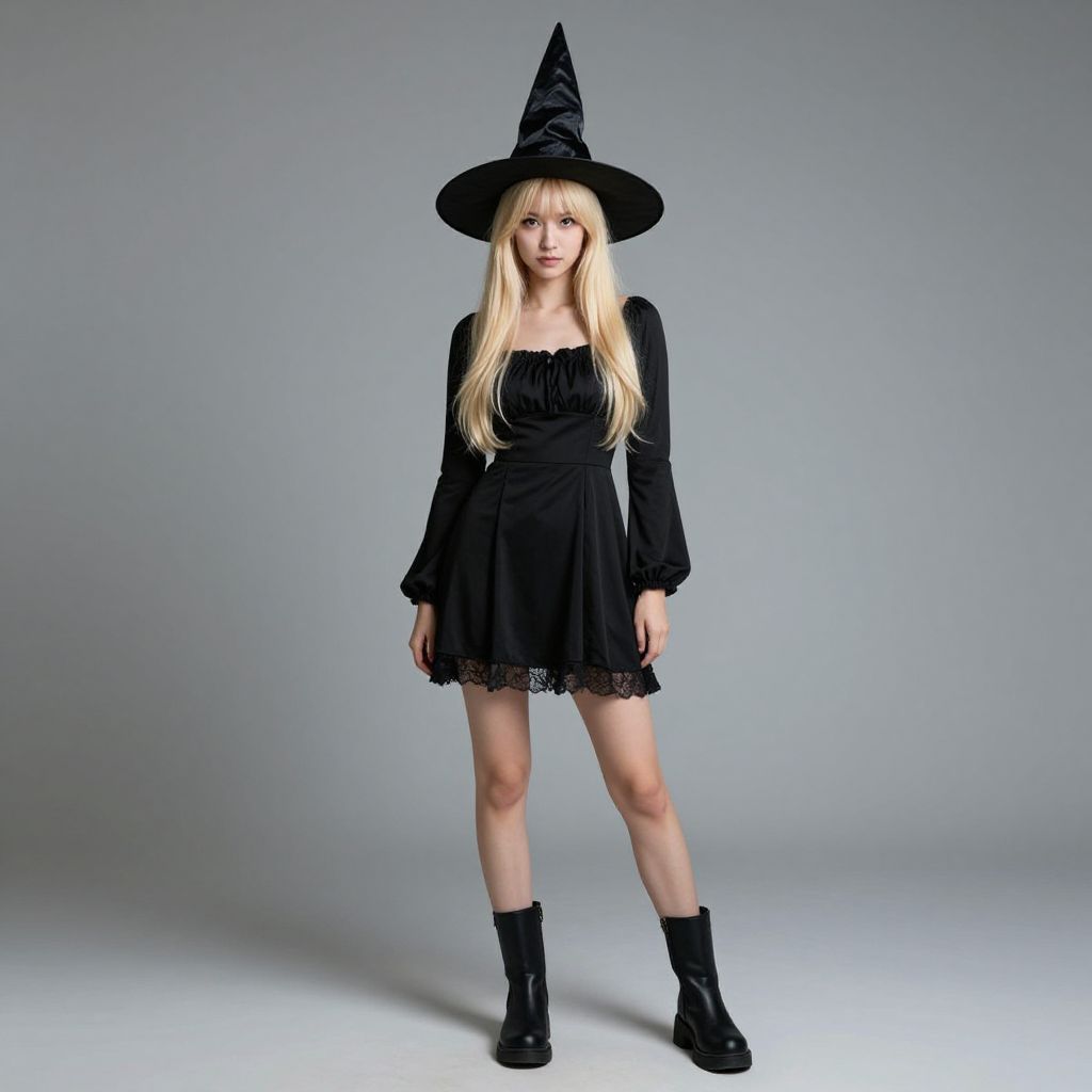 Photograph of a young woman with long, straight, platinum blonde hair wearing a black, long-sleeved, lace-trimmed dress that reaches mid-thigh. She also dons a tall, pointed black witch hat and black ankle boots with a slight heel. Her pale skin contrasts with her dark attire. She stands against a plain, light gray background, looking directly at the camera with a neutral expression. The lighting is even, highlighting her outfit and features. The overall style is modern and slightly gothic, emphasizing the witch costume theme.