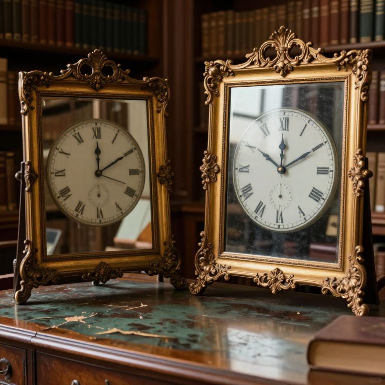 In a vintage library setting, two ornate gold-framed mirrors stand on a weathered desk, each reflecting alternate versions of time—one showing a reversed passage of events, the other capturing a moment frozen in eternity, rendered in a high-definition, computer-generated artistic style.