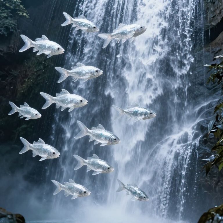Photograph of ten translucent, silver-white fish swimming in a vertical waterfall. The waterfall cascades from the top right to the bottom left, creating a dynamic, shimmering effect. The fish are positioned diagonally across the image, with some overlapping. The background is dark, contrasting with the bright, flowing water and the fish's reflective surfaces. The image captures a surreal, underwater-like scene with a sense of motion and fluidity.