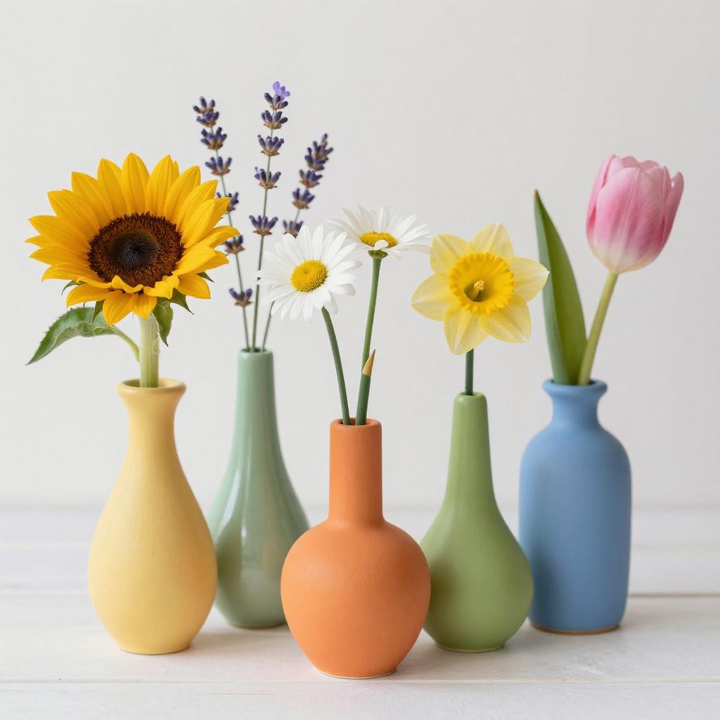 A row of five colorful ceramic vases in yellow, green, orange, green, and blue, each holding a different flower. Flowers include a bright yellow sunflower, purple lavender sprigs, white daisies, a yellow daffodil, and a pink tulip. The arrangement is photographed in a bright, evenly lit studio setting with a white background, showcasing the vibrant colors and delicate details of the flowers and vases.