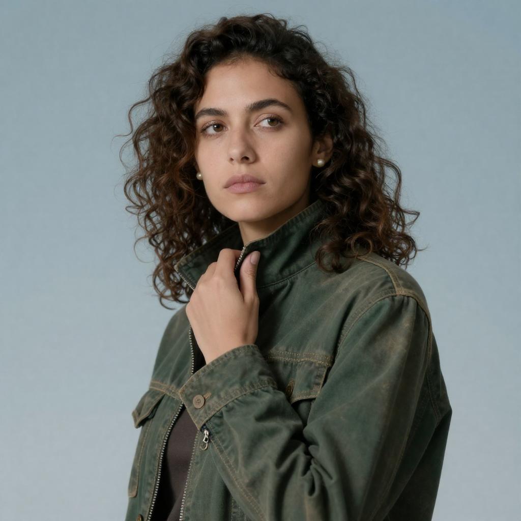Woman with curly brown hair, dark sunglasses, and tan jacket walks through a brightly lit indoor shopping mall. Ceiling has fluorescent lights, white tiles, and yellow beams. Background shows people and orange lockers. Casual, confident pose.