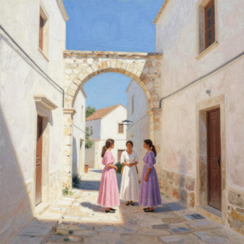 This is a pastel drawing of a sunlit, narrow stone alleyway in a quaint village. Three women, dressed in long, traditional dresses in shades of pink, purple, and white, stand near the center, facing each other. The background features white-washed buildings with a prominent, arched doorway at the top. The sky is a bright blue, and the light casts soft shadows on the stone path.