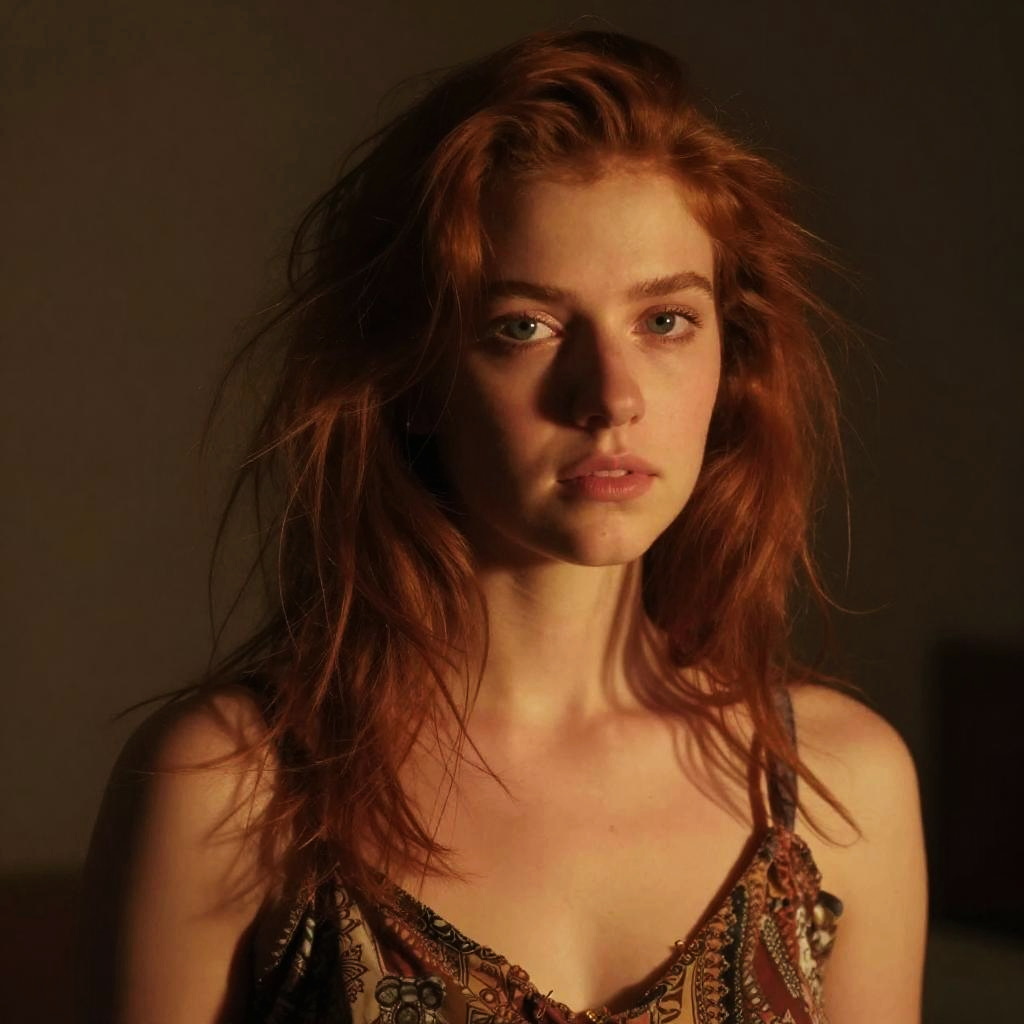 Photograph of a young woman with messy, shoulder-length, dark red hair. She's gazing directly at the camera with light blue eyes, wearing a sleeveless, patterned top. Warm, orange light highlights the right side of her face, creating a dramatic contrast against the dark, shadowy background. Her skin is fair and her expression is neutral, almost contemplative. The image has a soft, painterly texture.