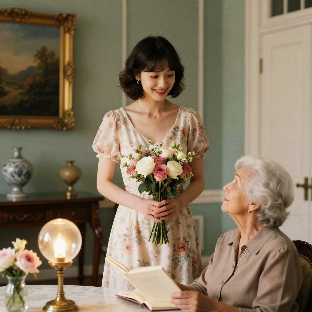 Photograph of two women in an elegant room. Young woman in floral dress, short hair, standing, holding bouquet, smiling. Elderly woman with white hair, seated, reading, looking up at young woman. Lamp with round glass shade on table. Background includes furniture, paintings, and a door.